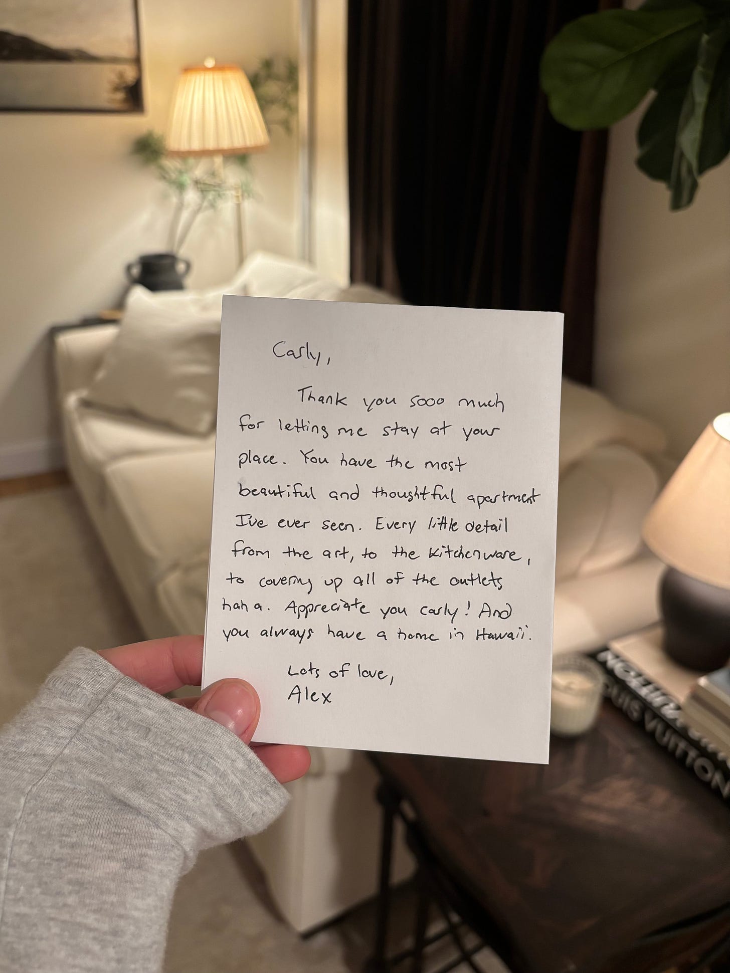 My friend Alex stayed at my apartment when I was gone, and I came back to flowers, dark chocolate and the most thoughtful note from him.