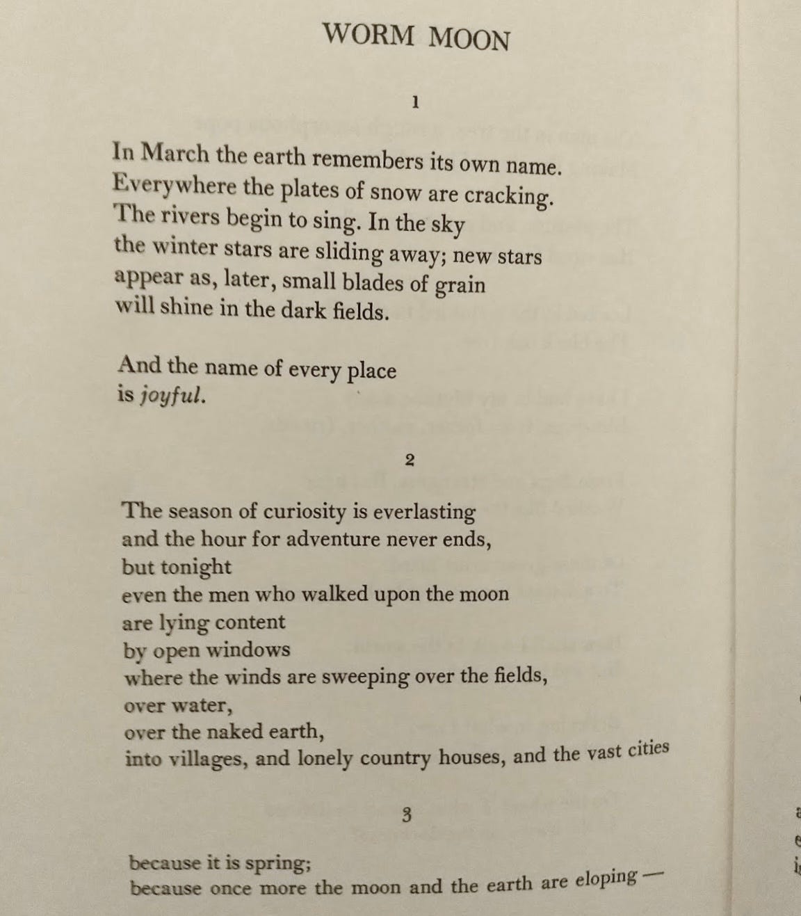 Every March, I have Mary Oliver’s Worm Moon on my mind - “but tonight even the men who walked upon the moon are lying content by open windows… because it is spring”. How beautiful?