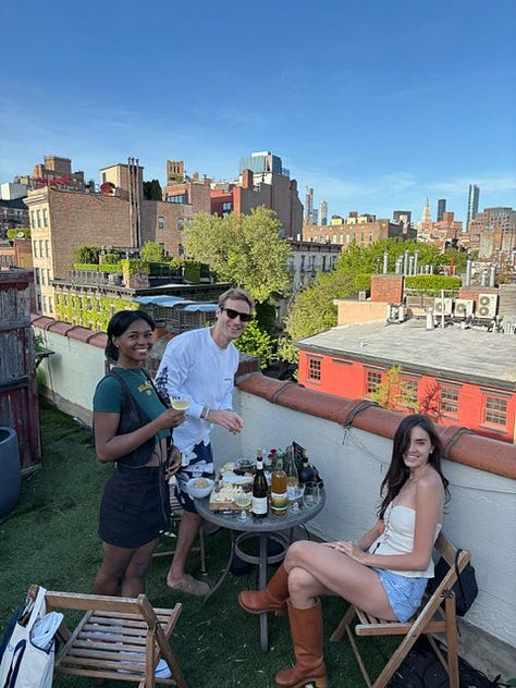 Besides the two big things, May was also filled with small springy moments & gatherings: picnics on the west side, Colony salad pizza, picking lily-of-the-valley, enjoying oysters at Waverly Inn with good company. My friend Aubrey hosted her first rooftop garden party of the summer, and my friend Austa hosted a terrace dinner where Erin made the most delicious Brami pasta and Austa crafted special garden cocktails, complete with a little garnish.